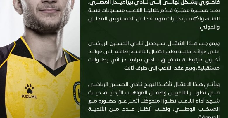 نادي الحسين يعلن انتقال لاعبه الفاخوري الى “بيراميدز” المصري