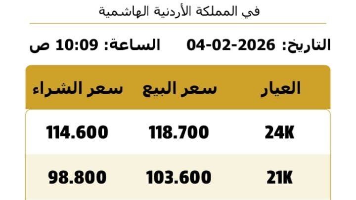حرير- سجّلت أسعار الذهب في السوق الأردني، اليوم الثلاثاء 4 شباط 2026، ارتفاعاً جديداً وفق التسعيرة الصادرة عن النقابة العامة لأصحاب محلات تجارة وصياغة الحلي والمجوهرات، ما يعكس استمرار حالة الصعود في المعدن الأصفر.