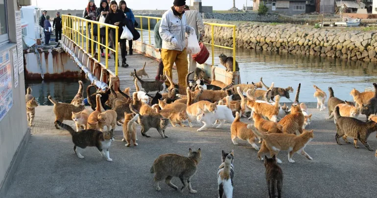 هذه الجزيرة، وفقا للونغلي، يفوق عدد القطط فيها عدد البشر، إذ لم يتبق فيها سوى 3 أشخاص مسنين هم: السيدة ناوكو كاميموتو، وزوجها هيدينوري، وجارهم السيد ماتسوشيتا.