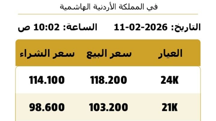 كما سجل غرام الذهب عيار 21 – الأكثر طلباً في السوق المحلية – 103.200 دينار للبيع، مقابل 98.600 دينار للشراء.