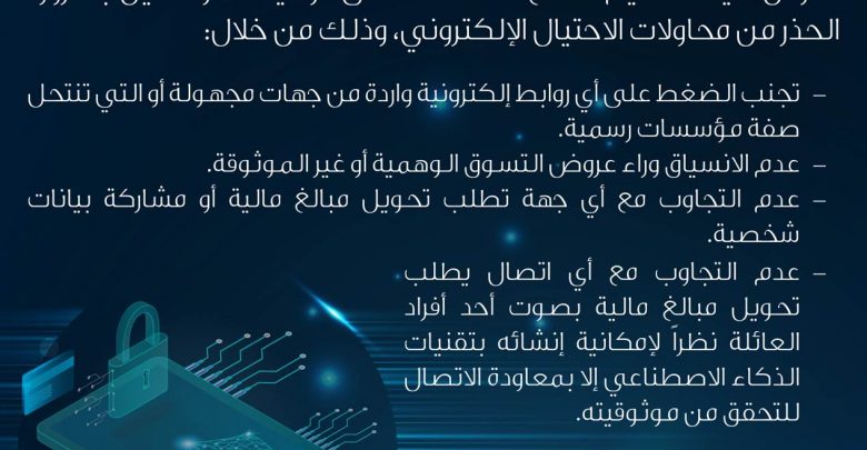 وأكدت الهيئة ضرورة عدم الاستجابة لأي اتصال يطلب تحويل مبالغ مالية بصوت أحد أفراد العائلة، نظرا لإمكانية إنشائه باستخدام تقنيات الذكاء الاصطناعي، إلا بعد معاودة الاتصال للتحقق من موثوقيته.