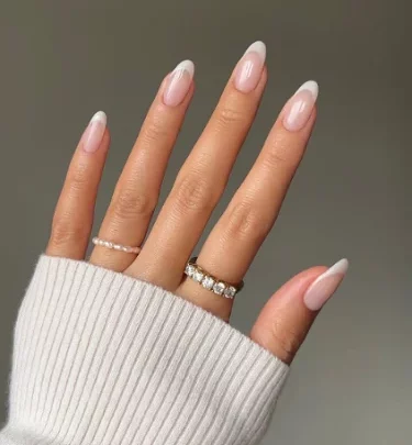 نسخة ناعمة من المانيكير الفرنسي الكلاسيكي، حيث تندمج الأطراف البيضاء بشكل تدريجي مع اللون النود، هذا التصميم يمنحك مظهرًا رقيقًا وأنثويًا، وكأنه مرسوم بخفة دون خطوط حادة، مما يجعله مناسبًا للاستخدام اليومي.