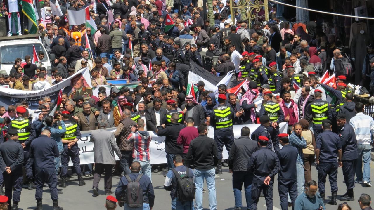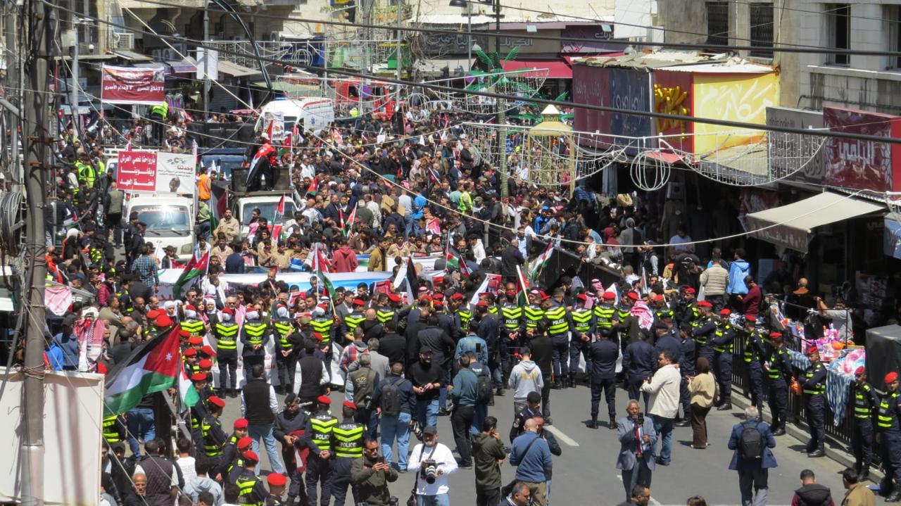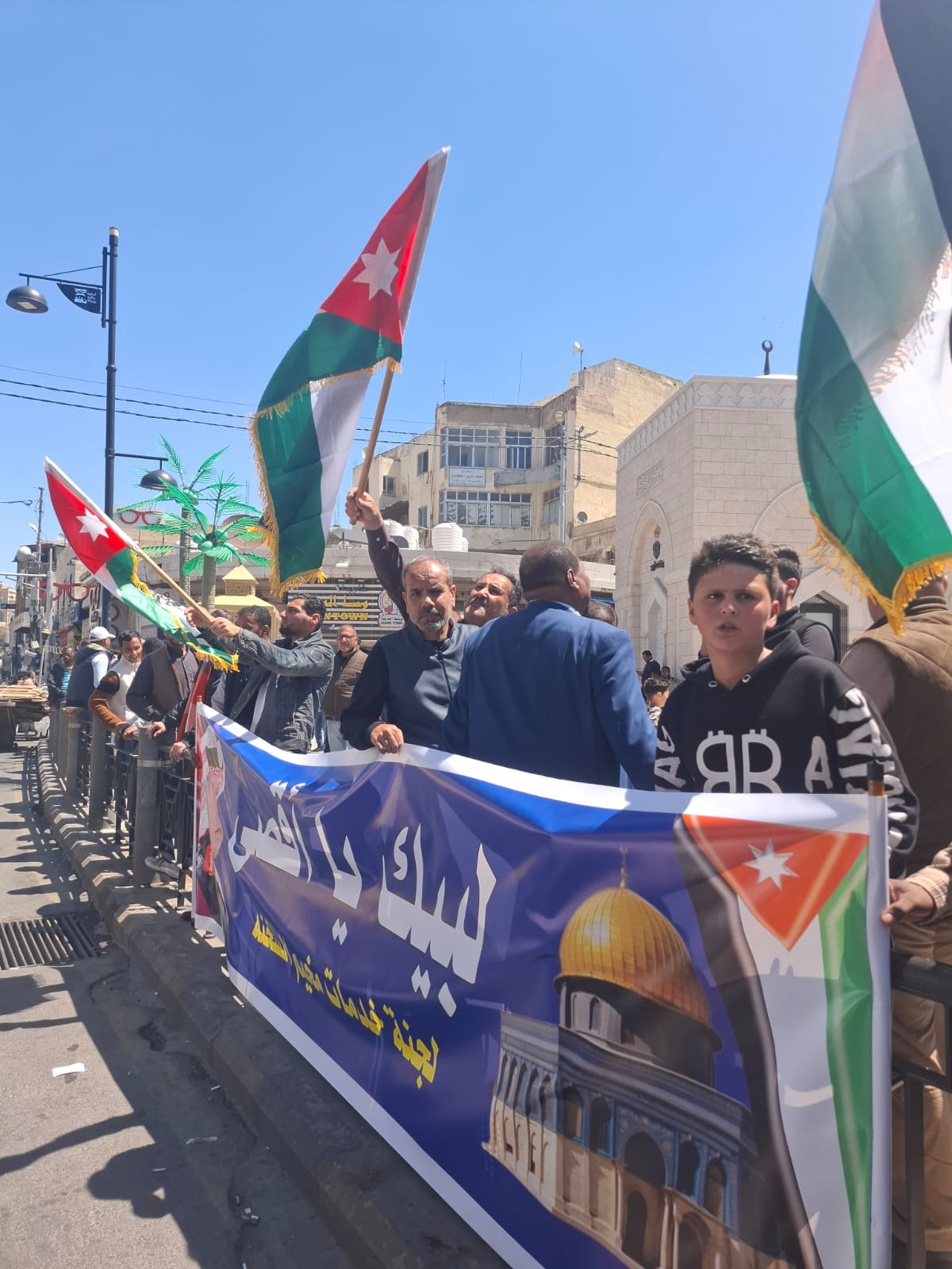 وأنطلقت المسيرة الشعبية الحاشدة من ساحات الجامع الحسيني الكبير بوسط العاصمة عمان بعد صلاة ظهر اليوم ” الجمعة ” لتجوب شوارعها رافعة يافطات الفخر والإعتزاز بجهود جلالة الملك في إعادة فتح ابواب المسجد الأقصى أمام المصلين في الأراضي الفلسطينية المحتلة ، و التي تؤكد على حق الوصاية الهاشمية عليه ، وعلى باقي الاماكن الدينية الإسلامية والمسيحية المقدسة في الأراضي الفلسطينية المحتلة .