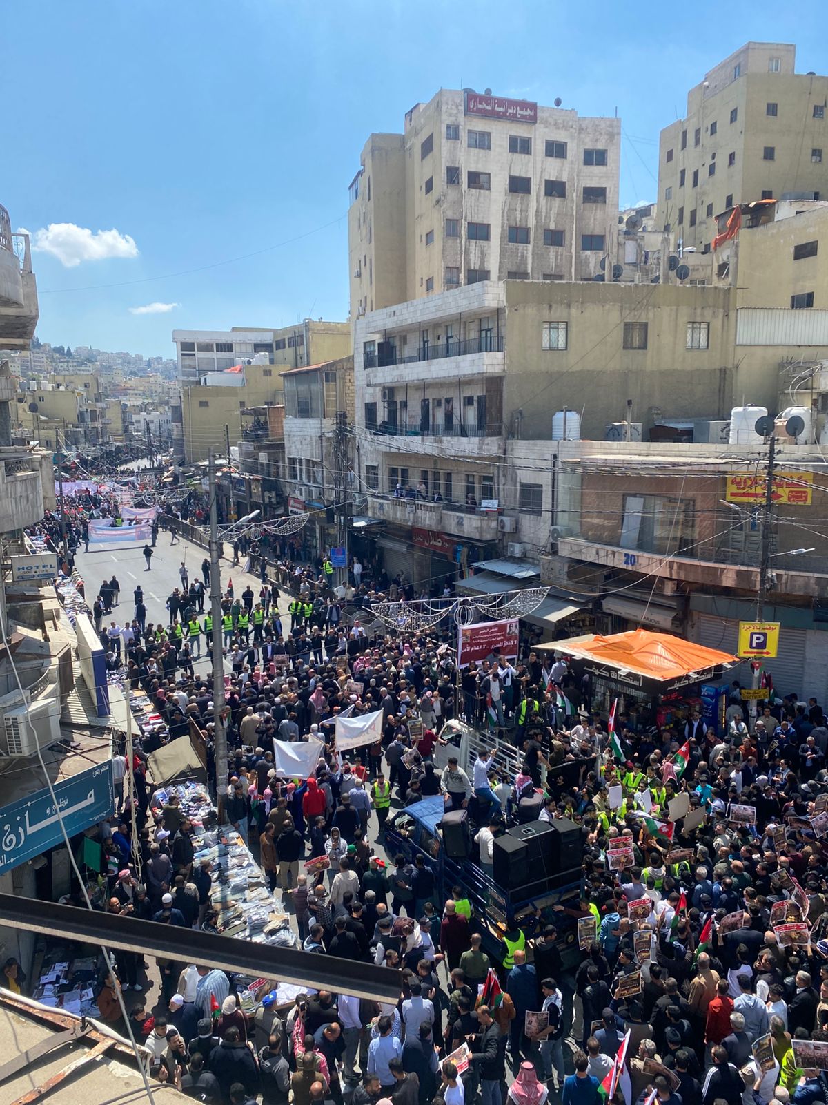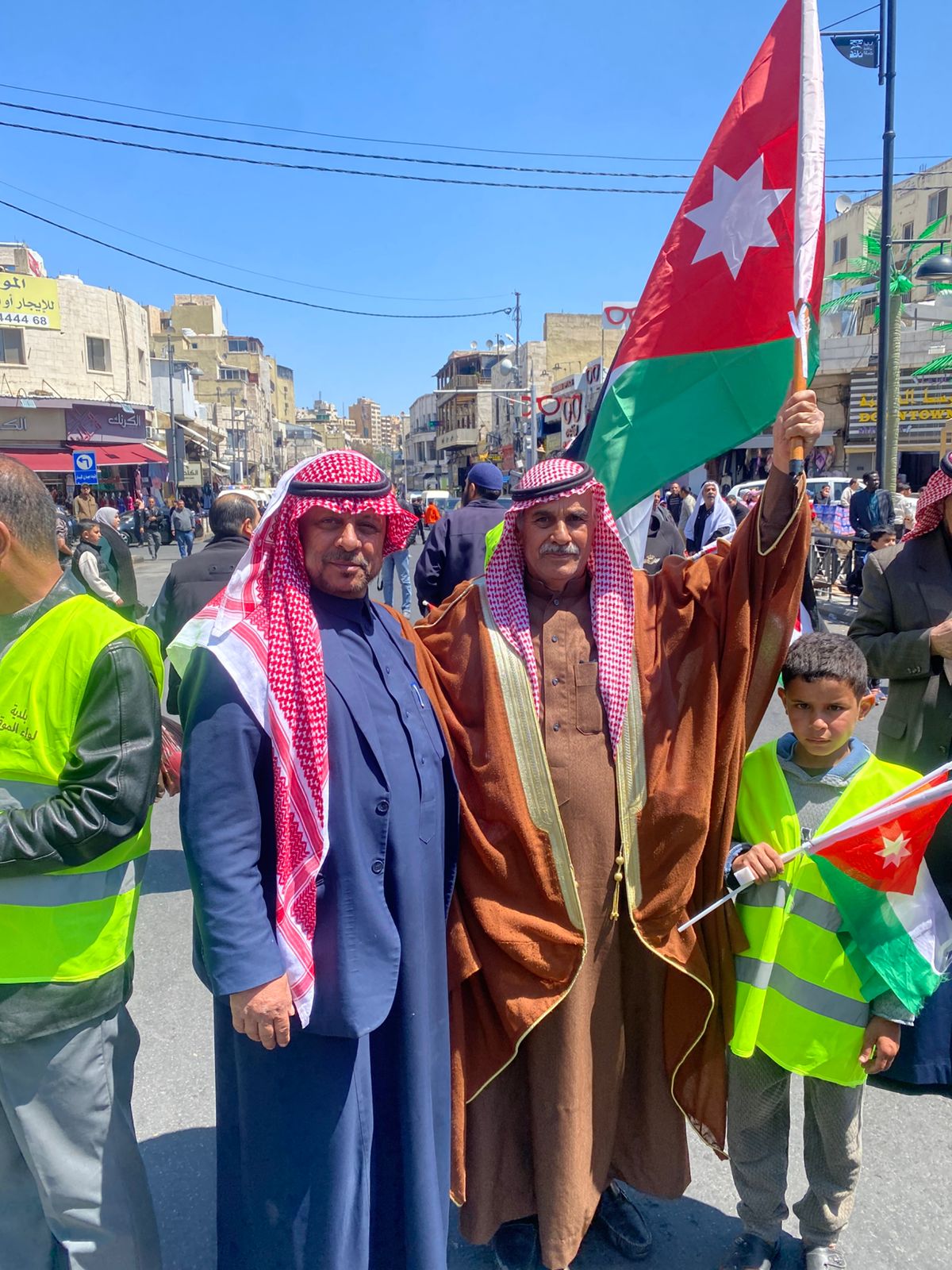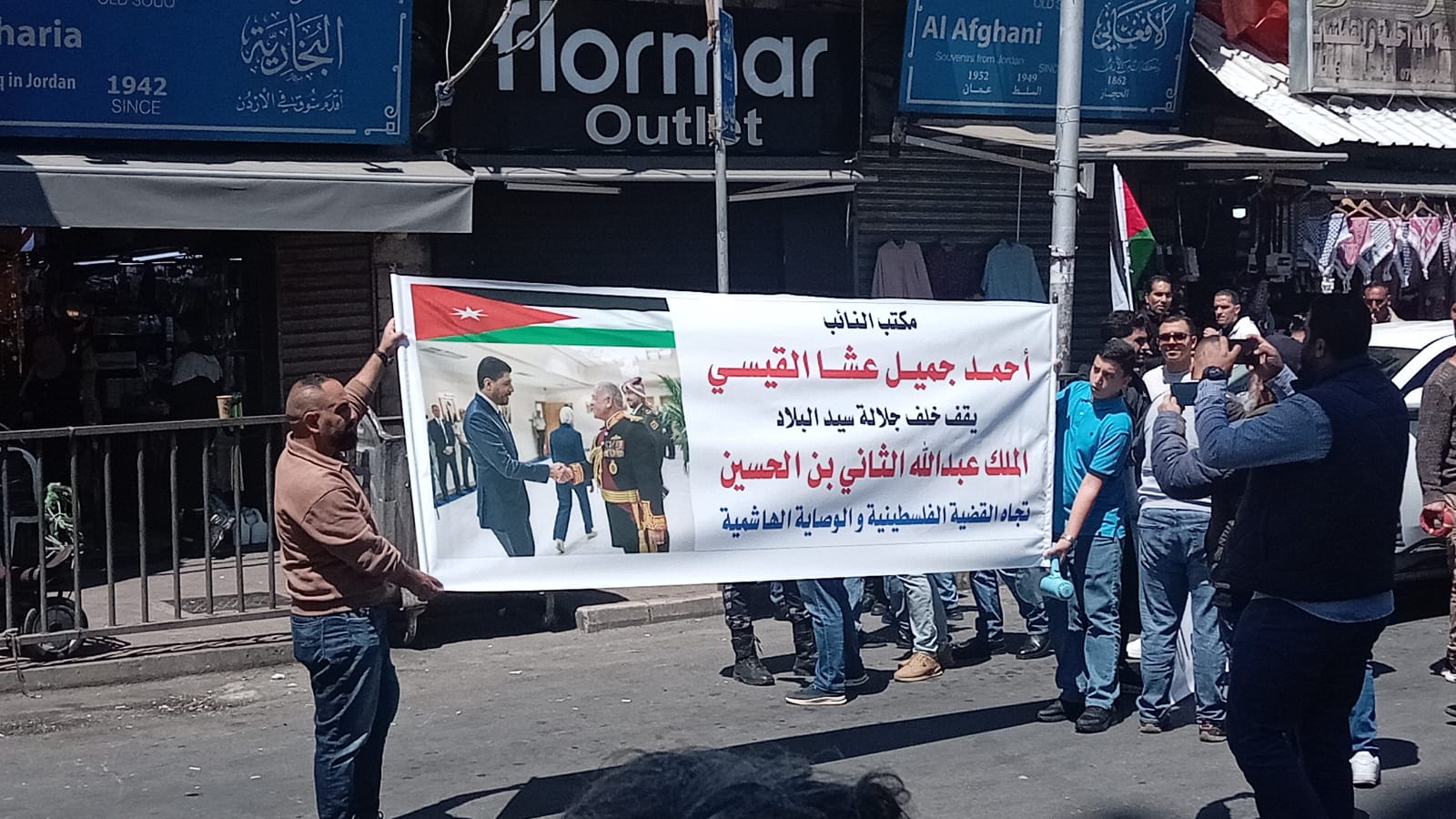 وأنطلقت المسيرة الشعبية الحاشدة من ساحات الجامع الحسيني الكبير بوسط العاصمة عمان بعد صلاة ظهر اليوم ” الجمعة ” لتجوب شوارعها رافعة يافطات الفخر والإعتزاز بجهود جلالة الملك في إعادة فتح ابواب المسجد الأقصى أمام المصلين في الأراضي الفلسطينية المحتلة ، و التي تؤكد على حق الوصاية الهاشمية عليه ، وعلى باقي الاماكن الدينية الإسلامية والمسيحية المقدسة في الأراضي الفلسطينية المحتلة .