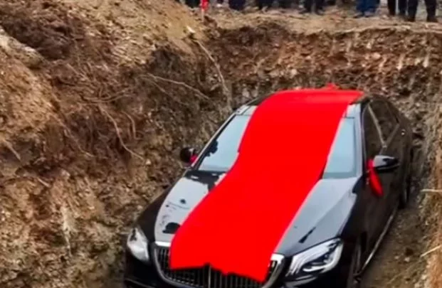 السيارة المدفونة كانت من طراز مرسيدس بنز S450L سوداء اللون وتبلغ قيمتها نحو 1.1 مليون يوان أى ما يعادل 161000 دولار، وكانت تحمل لوحة أرقام “8888” التى ترتبط فى الثقافة المحلية بالثروة، وتعد اللوحات التى تتضمن 4 أرقام متطابقة علامة على الحظ الجيد وقد يصل سعرها إلى 250 ألف يوان أى نحو 37000 دولار، وأظهر الفيديو استخدام حفار لرفع السيارة بجانب شاهد قبر تم تشييده حديثا، حيث غطيت السيارة بقطعة قماش حمراء وربطت شرائط حمراء بالمرايا الجانبية، قبل أن يساعد عشرات القرويين فى دفعها إلى القبر ودفنها بالتراب باستخدام المجارف، بحسب scmp.