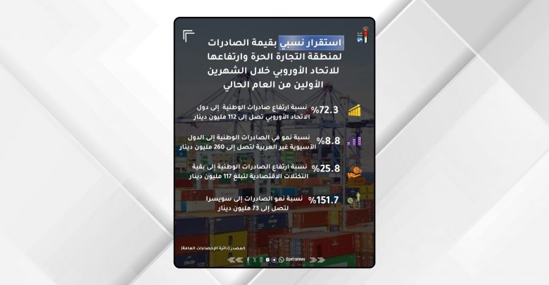استقرار نسبي بقيمة الصادرات لمنطقة التجارة الحرة وارتفاعها للاتحاد الأوروبي