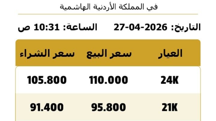 وبلغ سعر غرام الذهب عيار 21 الأكثر تداولا بين المواطنين 95.8 دينارا.