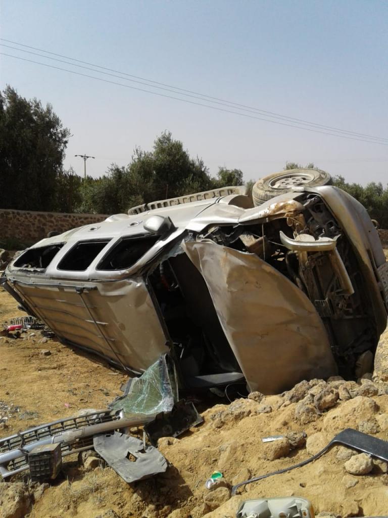 وأظهرت صور الحادث إلى انقلاب المركبة والاضرار الجسيمة الناتجة عن الحادث.