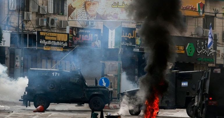 وفي جنين أفاد مصدر باقتحام قوات الاحتلال الإسرائيلي بلدة فقوعة شرقي المدينة بعدد من الآليات العسكرية.