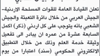 حرير- دعت القيادة العامة للقوات المسلحة الأردنية – دائرة التعبئة والجيش الشعبي، أنه يتوجب على كل أردني “ذكر” اكمل السابعة…