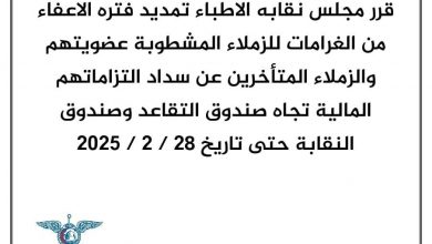 نقابة الأطباء تمدد فترة الإعفاء من الغرامات حتى الـ28 من الشهر المقبل