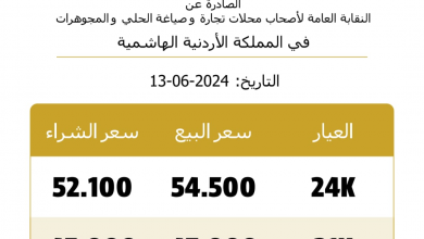 حرير- استقرت أسعار الليرة الذهبية اليوم الأحد في الأردن وفق أمين سر النقابة العامة لأصحاب محلات تجارة الحلي والمجوهرات، سليم…