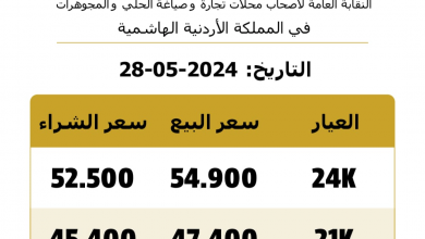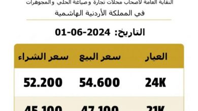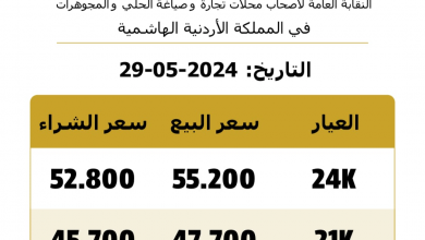 حرير- انخفض سعر غرام الذهب اليوم الخميس 60 قرشاً في الأردن، وفق نقابة اصحاب محلات الحلي والمجوهرات. وبلغ سعر غرام…