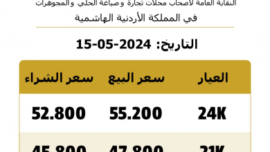 حرير- ارتفعت أسعار غرام الذهب اليوم الخميس في الأردن 60 قرشاً، وفق نقابة اصحاب محلات الحلي والمجوهرات. وبلغ سعر غرام…