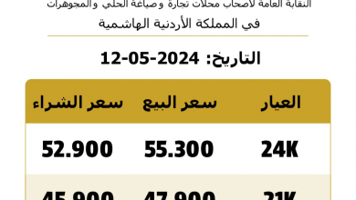 حرير- ارتفعت أسعار غرام الذهب اليوم الأربعاء في الأردن 40 قرشاً، وفق نقابة اصحاب محلات الحلي والمجوهرات. وبلغ سعر غرام…