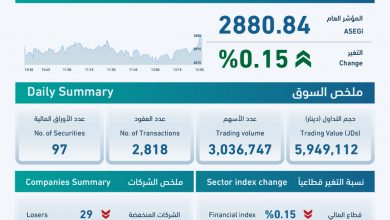 حرير- اغلقت بورصة عمان، اليوم الأحد، تداولاتها على ارتفاع نسبته 0.15 بالمئة الى مستوى 2880 نقطة. وبلغت كمية الأسهم المتداولة…