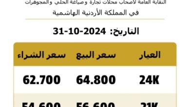 حرير- ارتفعت أسعار الذهب في الأردن 20 قرشا للغرام اليوم الاثنين ، ليصل سعر غرام الذهب من عيار 21 الى…
