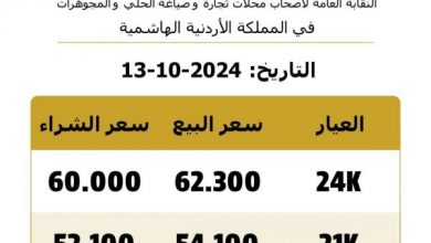 حرير- ارتفعت اسعار الذهب في الأردن 80 قرشا للغرام وفقا للتسعيرة اليومية الصادرة عن النقابة العامة لاصحاب محلات تجارة الحلي…