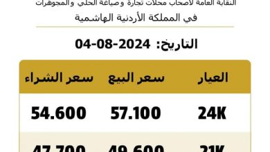 حرير- استقرت أسعار الذهب في الأردن، وذلك بحسب تسعيرة صادرة الثلاثاء عن نقابة تجار الحلي والمجوهرات. ووفقا للتسعيرة استقر سعر…