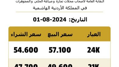 حرير- بلغ سعر بيع غرام الذهب عيار 21 الأكثر رغبة من المواطنين في السوق المحلية اليوم الاحد 48,40 دينار لغايات…